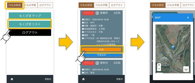 アプリ内の「もくげきマップ」をタップすると一覧で目撃情報を見ることができます。
