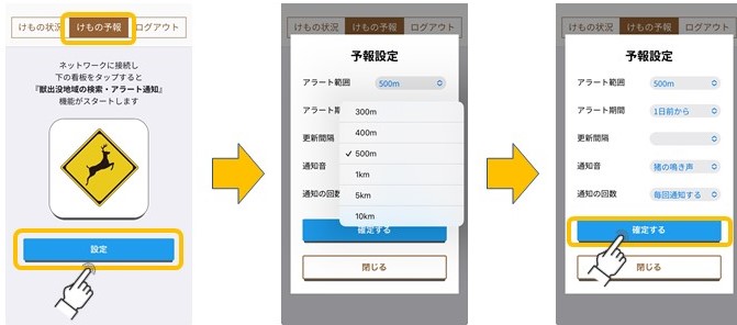 「けもの予想」を設定すると周辺地域を中心にアラート通知を受け取ることができます。