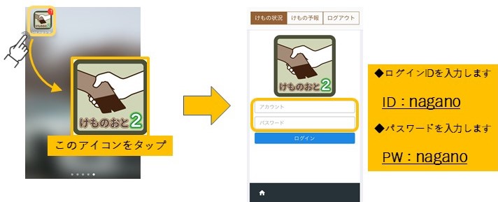 アプリの利用には「ログインID」と「パスワード」の入力が必要です。下記画像に記載されているID・パスワードを入力してください。